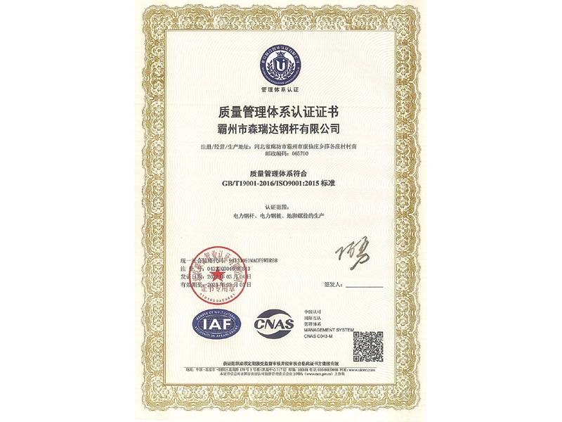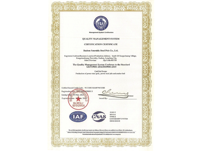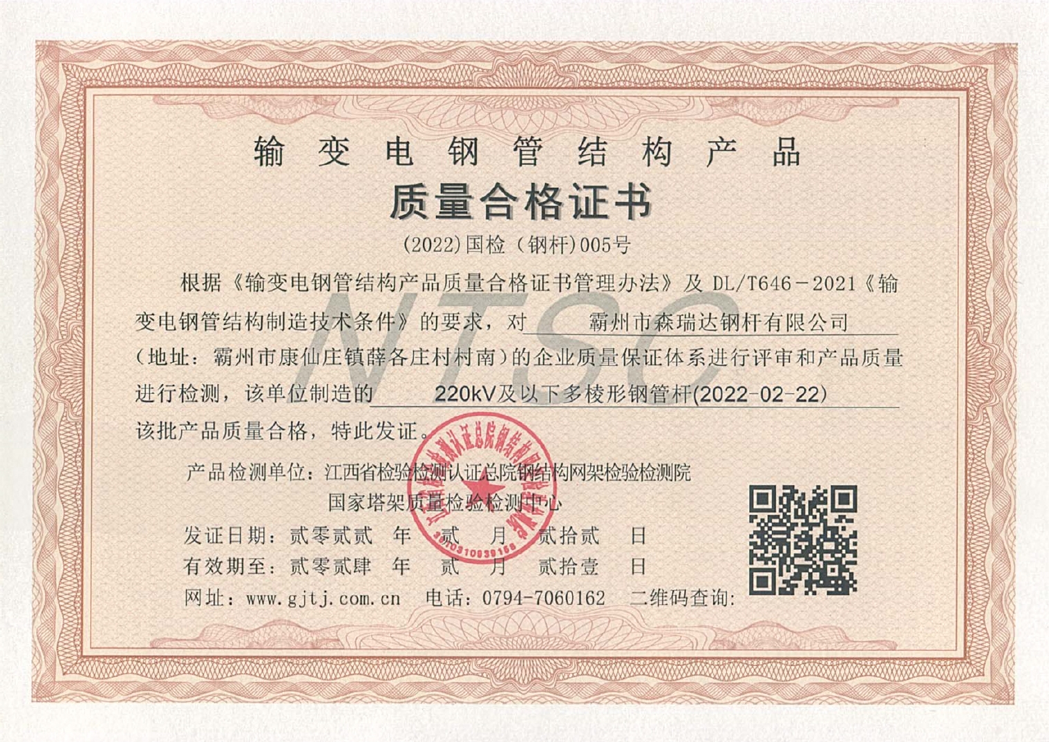 输变电钢管结构产品质量合格证书